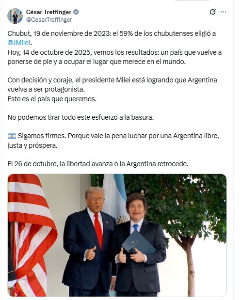 Las declaraciones Treffinger fueron realizadas a través de la red social X, donde acompañó su publicación con una imagen del presidente Milei junto a Donald Trump, dejando en claro el fortalecimiento del vínculo político e ideológico entre ambos líderes.