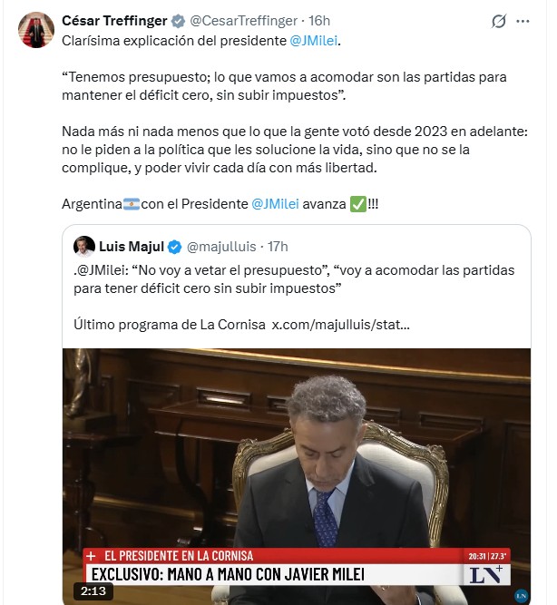 A través de su cuenta en la red social X, Treffinger celebró las declaraciones del mandatario, quien aclaró públicamente que “no voy a vetar el presupuesto”, aunque sí adelantó que “voy a acomodar las partidas para tener déficit cero sin subir impuestos”.