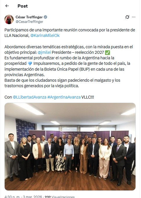 “Participamos de una importante reunión convocada por la presidente de LLA Nacional, Karina Milei. Abordamos diversas temáticas estratégicas, con la mirada puesta en el objetivo principal: Javier Milei Presidente – reelección 2027”, expresó Treffinger.