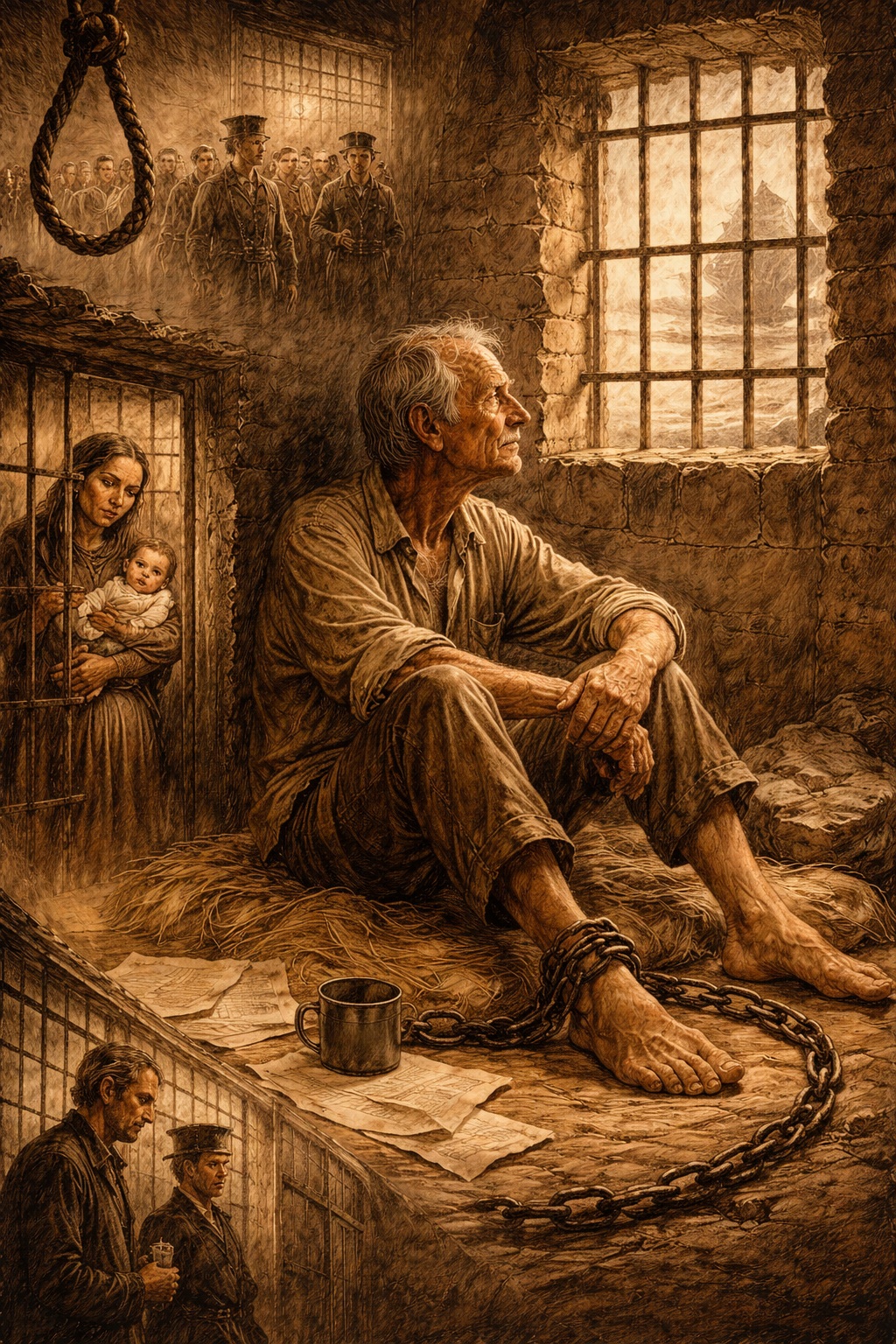 Se hallaba en el último escalón de la desgracia. Había intentado fugarse perforando el suelo en un arranque de desesperación, y la vigilancia pesaba sobre él incesante y amenazadora. Si cantaba, le imponían silencio. Quiso divertirse rezando con monótono canturreo las oraciones que le enseñó su madre y que solo recordaba a trozos, y le hicieron callar. ¿Es que intentaba fingirse loco? A ver, mucho silencio. Le querían guardar entero sano de cuerpo y espíritu para que el verdugo no operase en carne averiada.