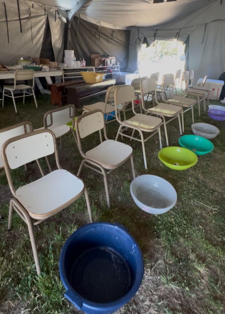 La carpa de atención, ubicada en el sector de Pucón Pai, se ha convertido en un punto de referencia para los brigadistas, quienes reciben alimentos, agua, ropa y otros suministros esenciales para seguir adelante con su labor.
