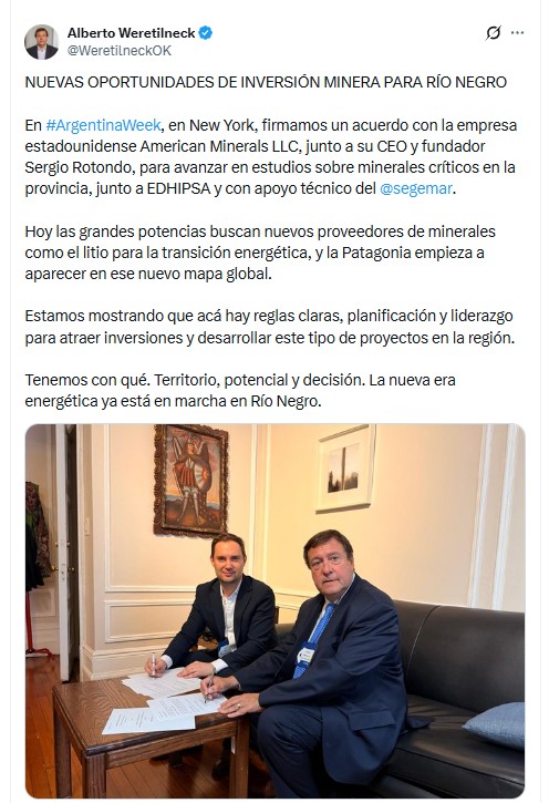 El gobernador de Río Negro, Alberto Weretilneck, anunció la firma de un acuerdo con la empresa estadounidense American Minerals LLC para avanzar en estudios vinculados a minerales críticos en la provincia, en el marco de la Argentina Week que se desarrolla en Nueva York.