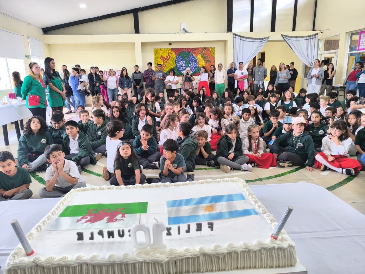 Durante la celebración por los diez años de la escuela, se realizó el tradicional corte de torta y el canto del feliz cumpleaños en galés, compartido por toda la comunidad educativa.